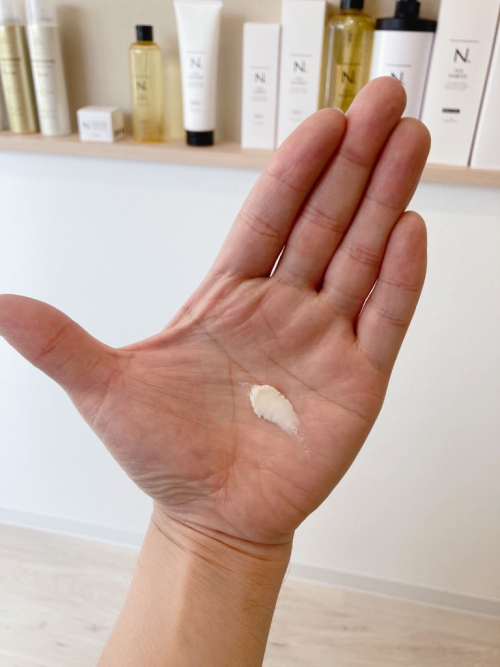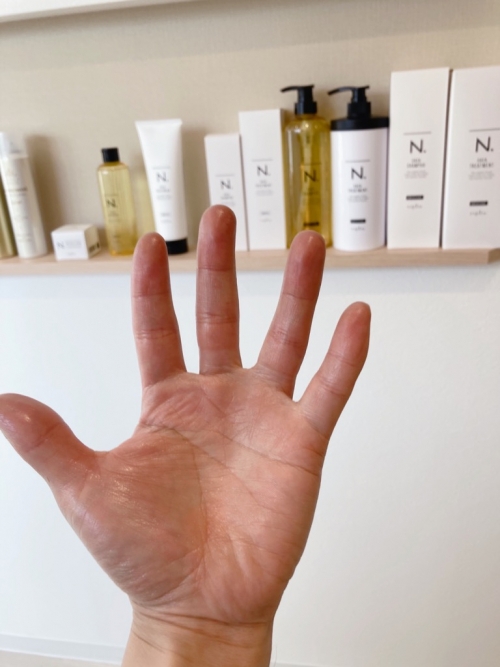 全体の中間毛先に馴染んだら(ウエット感!!)まだ手に残ってるので、再度手に馴染ませ